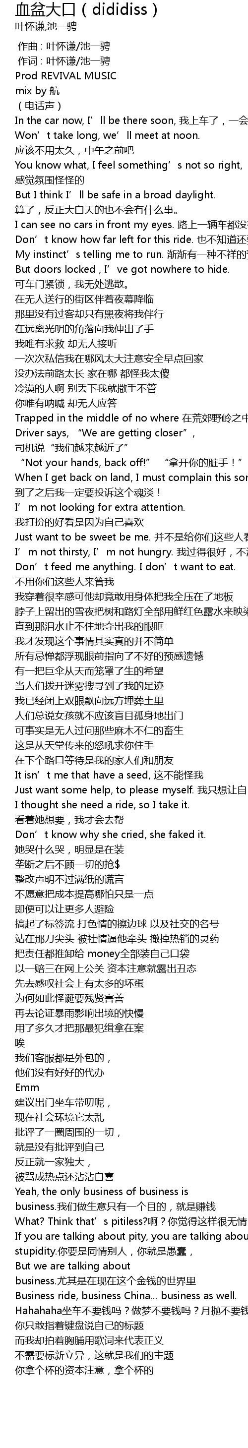 | [02:39.86] | Business ride, business China... business as well. Hahahaha坐车不要钱吗?做梦不要钱吗?月抛不要钱吗? |