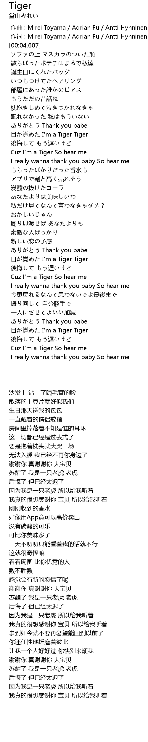 | [02:13.899] | mù jué I' m a Tiger Tiger |