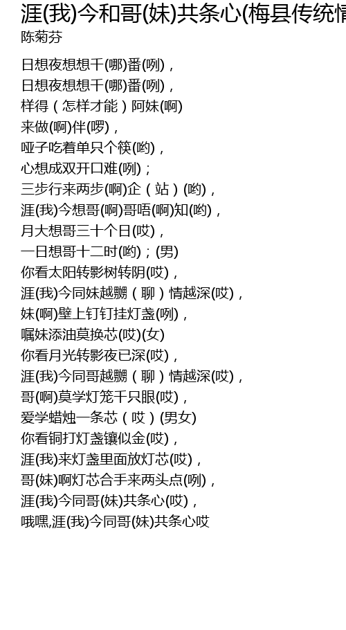 | 涯(我)今同哥(妹)共条心(哎), | |