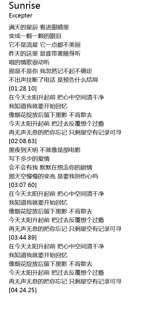| [04:05.52] | 今天太阳升起前 把过去反覆想个过瘾 |