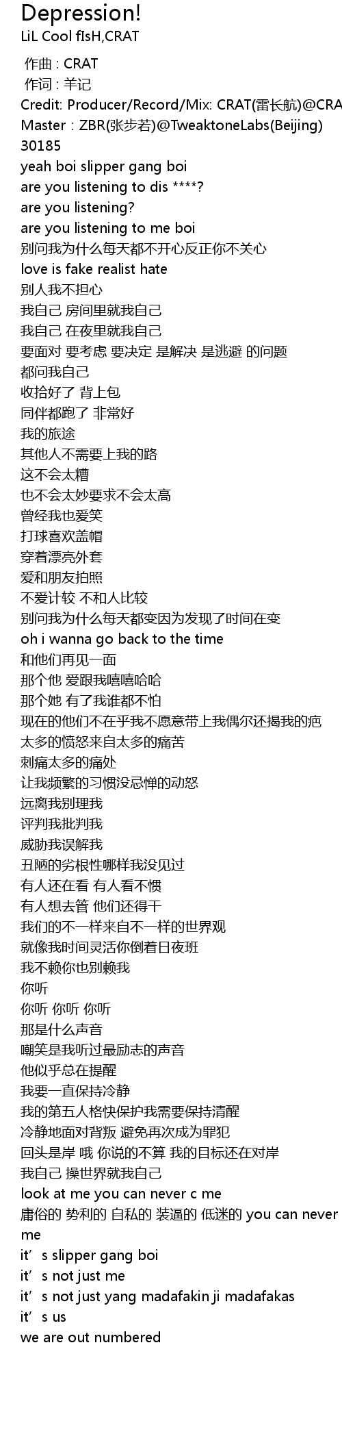 | [00:00.100] | Credit: Producer Record Mix: CRAT lei zhang hang CRAT Studio Master: ZBR zhang bu ruo TweaktoneLabs Beijing |