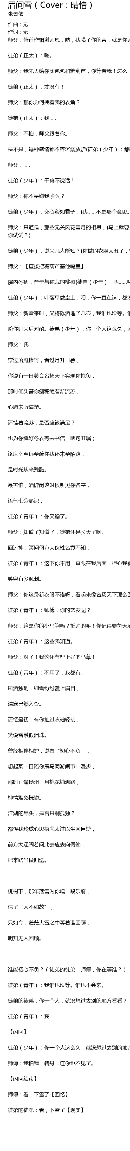 | 师父:只道是,那些无关风花雪月的相思,(马上就要出师了,我给你准备了新衣裳, 你试试?) | |