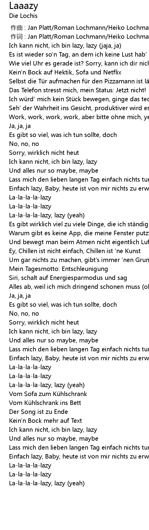 | [00:05.234] | Ich kann nicht, ich bin lazy, lazy (jaja, ja) |