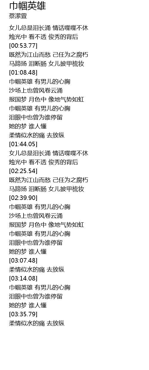 | [03:25.79] | 巾帼英雄 有男儿的心胸 |