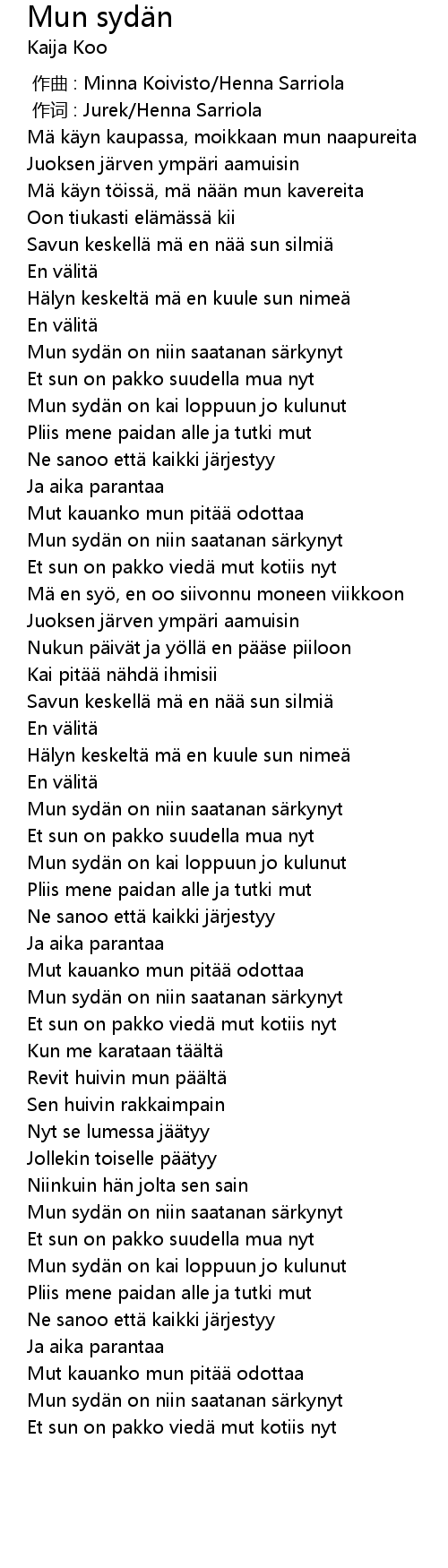 | [02:01.92] | Mun syd n on kai loppuun jo kulunut |