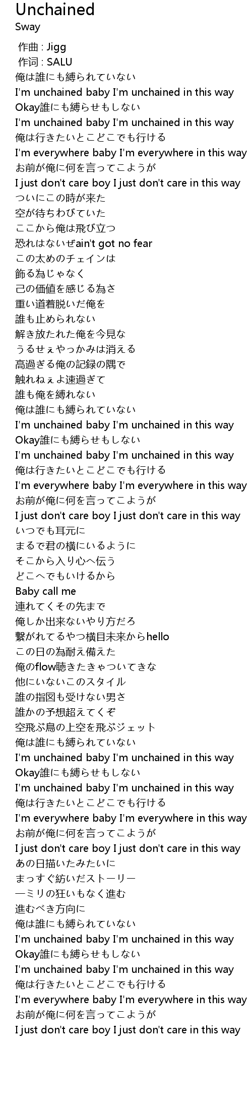| [01:37.47] | I'm unchained baby I'm unchained in this way |