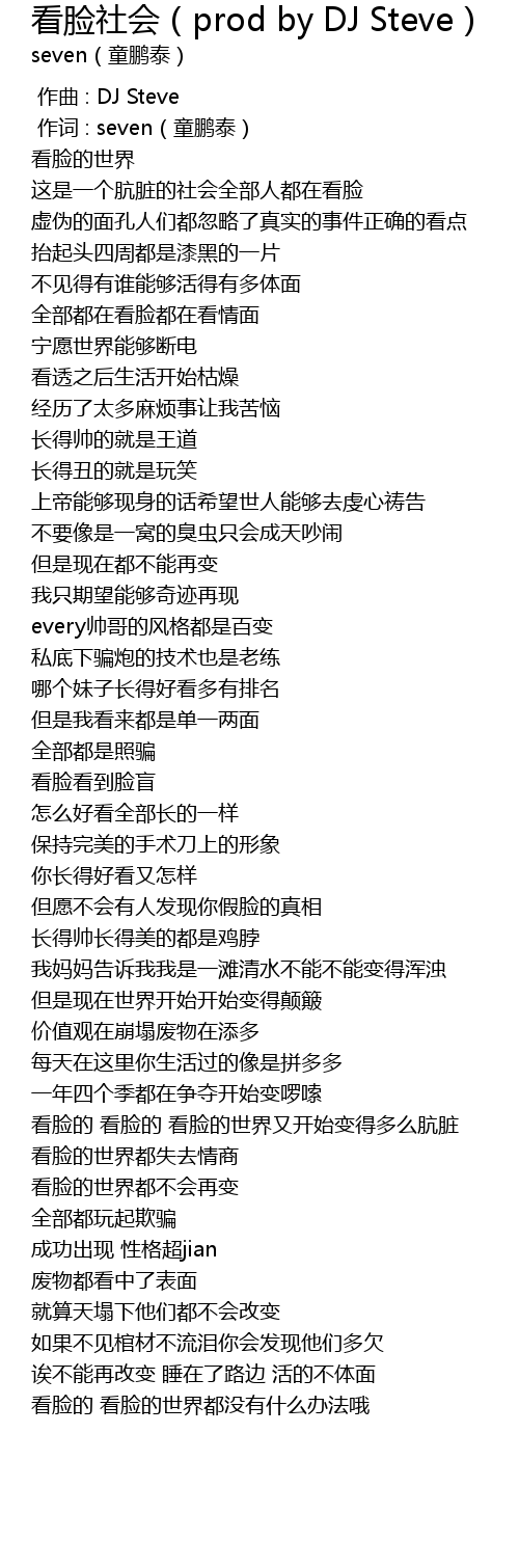| [00:14.520] | 这是一个肮脏的社会全部人都在看脸 |