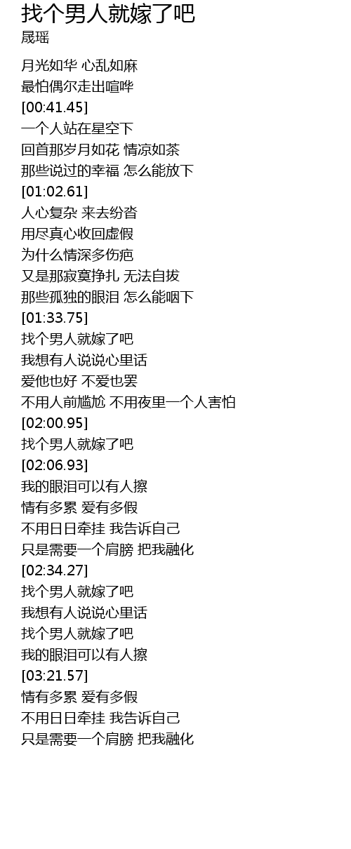 | [03:11.47] | zhǎo gè nán rén jiù jià le ba |