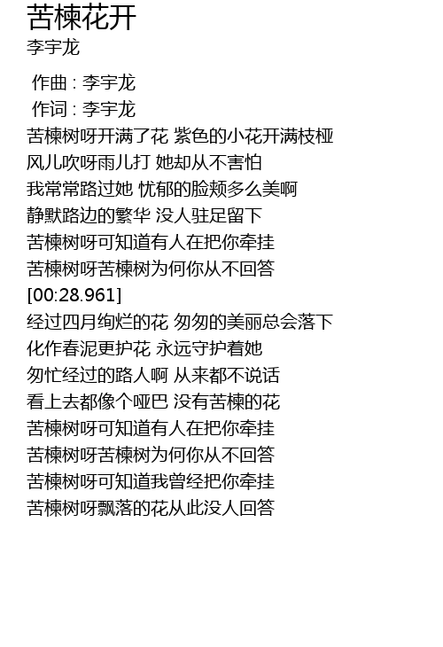 | [00:28.961] | 苦楝树呀苦楝树为何你从不回答 |