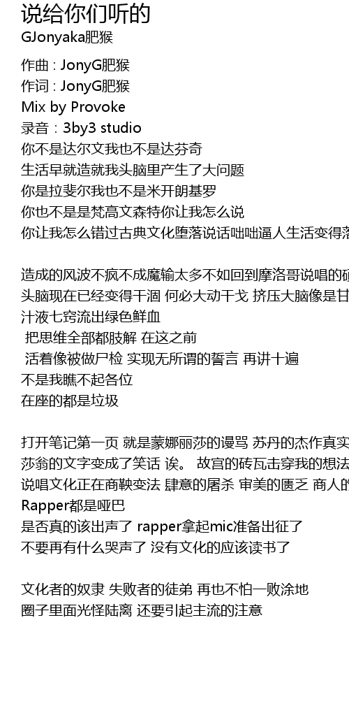 | 打开笔记第一页 就是蒙娜丽莎的谩骂 苏丹的杰作真实的谎话 莎翁的文字变成了笑话 诶。 故宫的砖瓦击穿我的想法 说唱文化正在商鞅变法 肆意的屠杀 审美的匮乏 商人的鬼话 Rapper都是哑巴 | |
