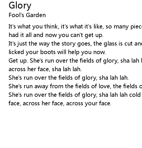 Get up. She's run over the fields of glory, sha lah lah, cold rain is slapping across her face, sha lah lah. |