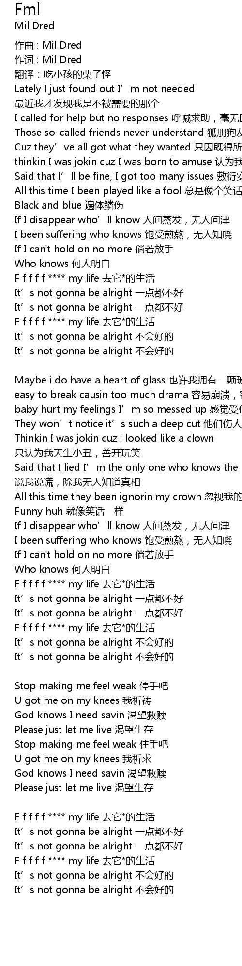 | Said that I' ll be fine, I got too many issues fu yan an wei, ma wo shen jing | |