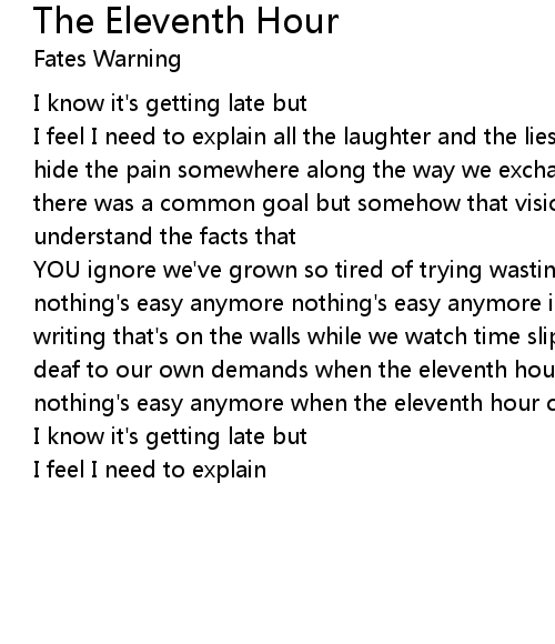 YOU ignore we've grown so tired of trying wasting our time criticizing and nothing's easy anymore nothing's easy anymore is it too late to understand the writing that's on the walls while we watch time slip through our hands we're deaf to our own demands when the eleventh hour calls the eleventh hour calls and nothing's easy anymore when the eleventh hour calls the eleventh hour calls |