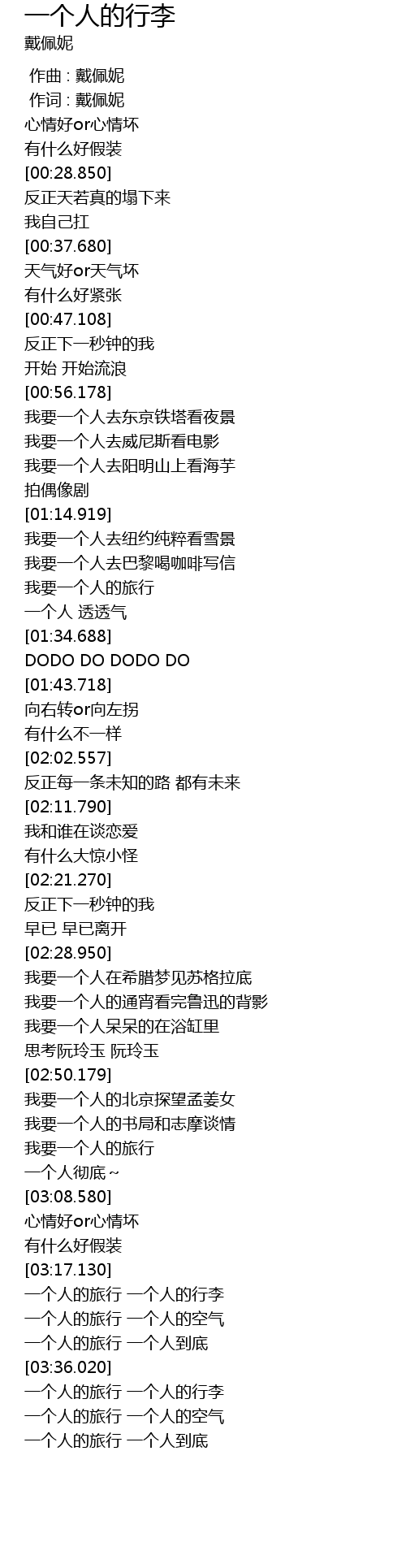 | [03:20.140] | 一个人的旅行 一个人的行李 |
