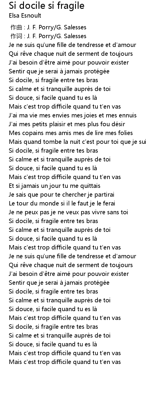 | [02:19.272] | Si docile, si fragile entre tes bras |