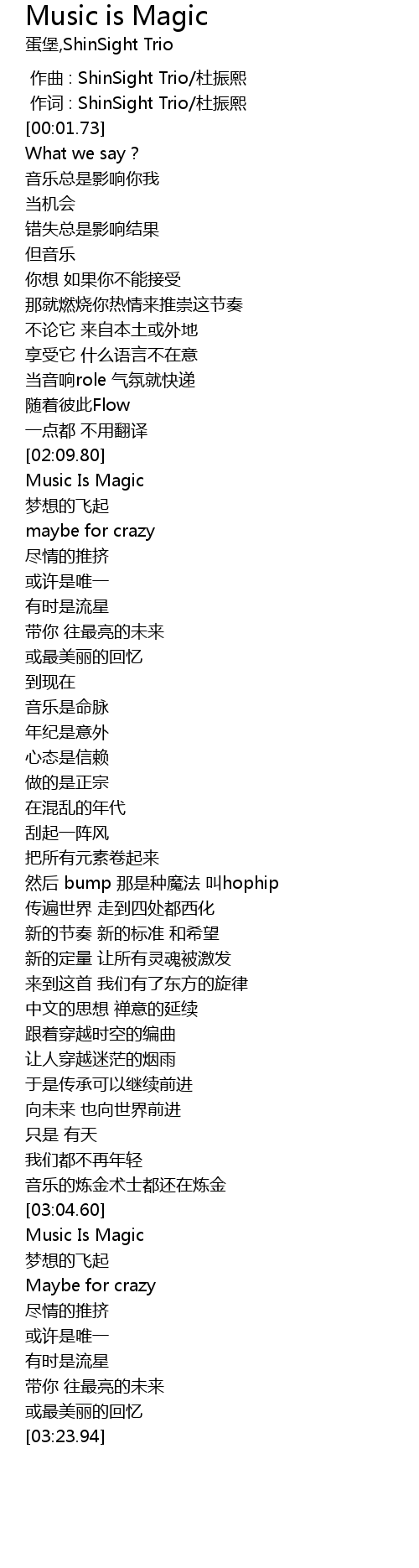 | [00:00.357] | 作词 : ShinSight Trio/杜振熙 |