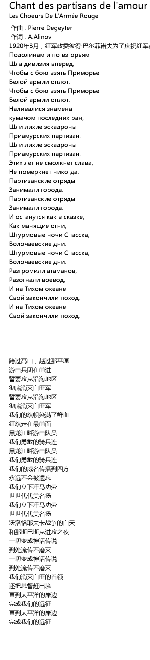 | [00:00.200] | 1920年3月,红军政委彼得·巴尔菲诺夫为了庆祝红军在远东的胜利,在海参崴写下了歌词。1922年全歼入侵者后,又把“远东特别部队”战斗的几个具有历史意义的地点(“斯巴斯克”,“沃洛恰恩卡”)写进歌词里去。1926年7月,阿·亚历山大罗夫在基辅附近的达尔尼查村,从136步兵连的连长阿都罗夫处记录下这首歌的曲谱,并改编为歌舞团的演出曲目,此后这首歌驰名世界。 |