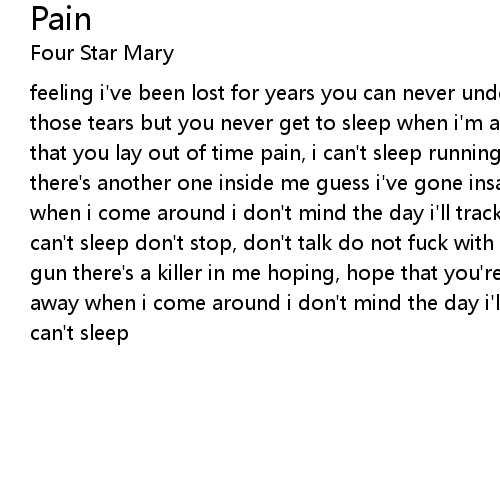 feeling i've been lost for years you can never understand me unless you've seen those tears but you never get to sleep when i'm away i don't mind the deeper that you lay out of time pain, i can't sleep running, running from those days there's another one inside me guess i've gone insane but you always run away when i come around i don't mind the day i'll track you down run you down pain, i can't sleep don't stop, don't talk do not fuck with me loaded, loaded up this gun there's a killer in me hoping, hope that you're the one but you always run away when i come around i don't mind the day i'll track you down terrify pain, i can't sleep |