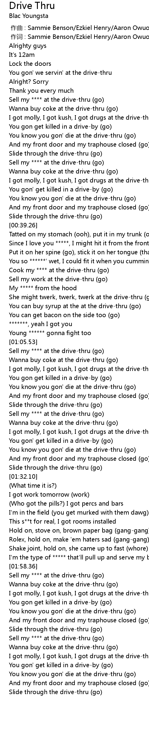| [01:58.66] | Sell my **** at the drive-thru (go) |