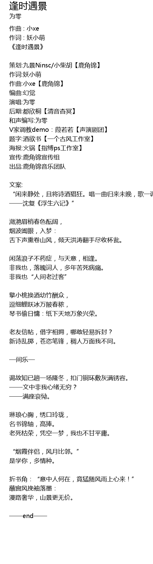 | “闲来静处,且将诗酒猖狂。唱一曲归来未晚,歌一调湖海茫茫。逢时遇景,拾翠寻芳。 | |
