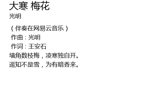 | [00:29.000] | 墙角数枝梅,凌寒独自开。 |