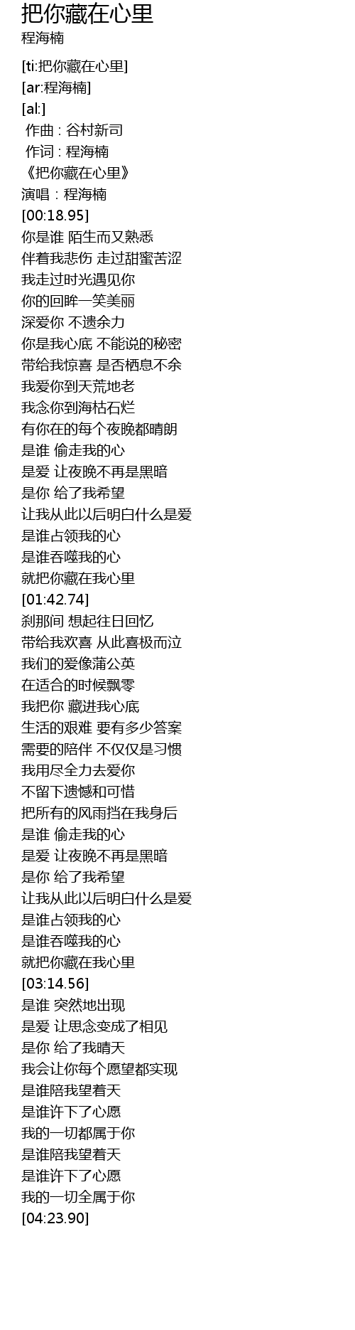 | [00:00.91] | bǎ nǐ cáng zài xīn lǐ |