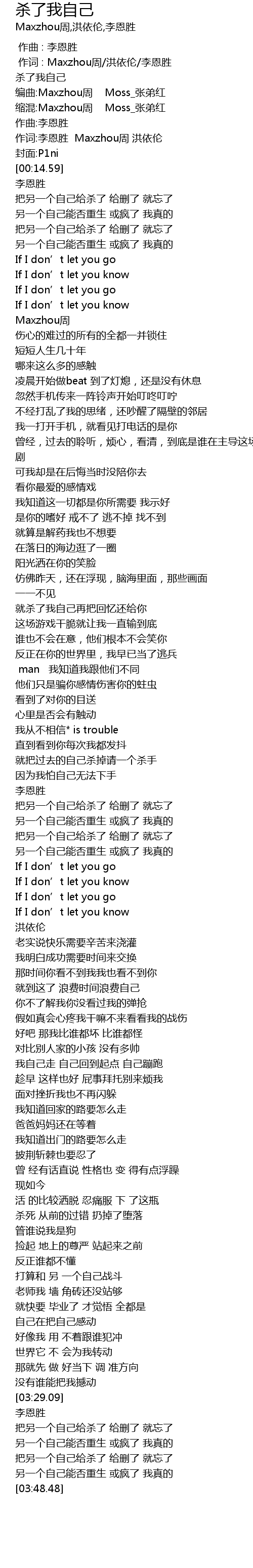 | [01:53.77] | bǎ lìng yí gè zì jǐ gěi shā le gěi shān le jiù wàng le |