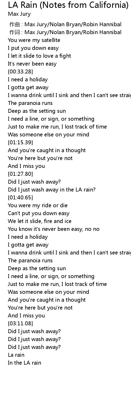 | [01:31.89] | Did I just wash away in the LA rain? |
