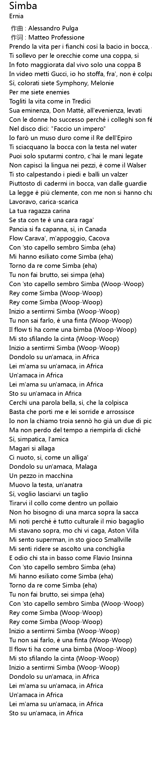 | [02:25.76] | Con 'sto capello sembro Simba (Woop-Woop) |