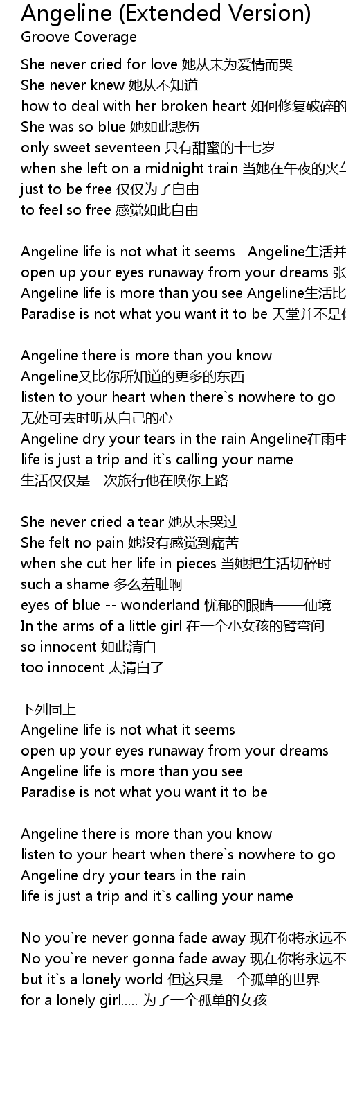 | Angeline there is more than you know Angeline yòu bǐ nǐ suǒ zhī dào de gèng duō de dōng xī | |
