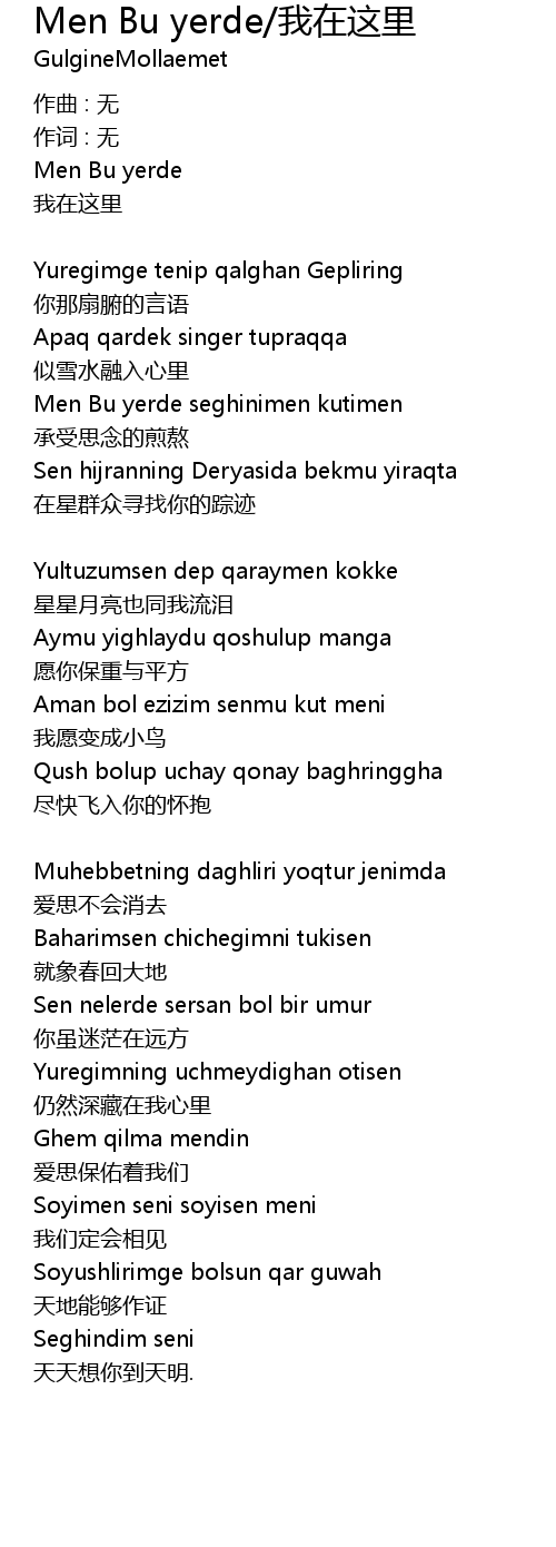 | Song | Men Bu yerde/我在这里 |