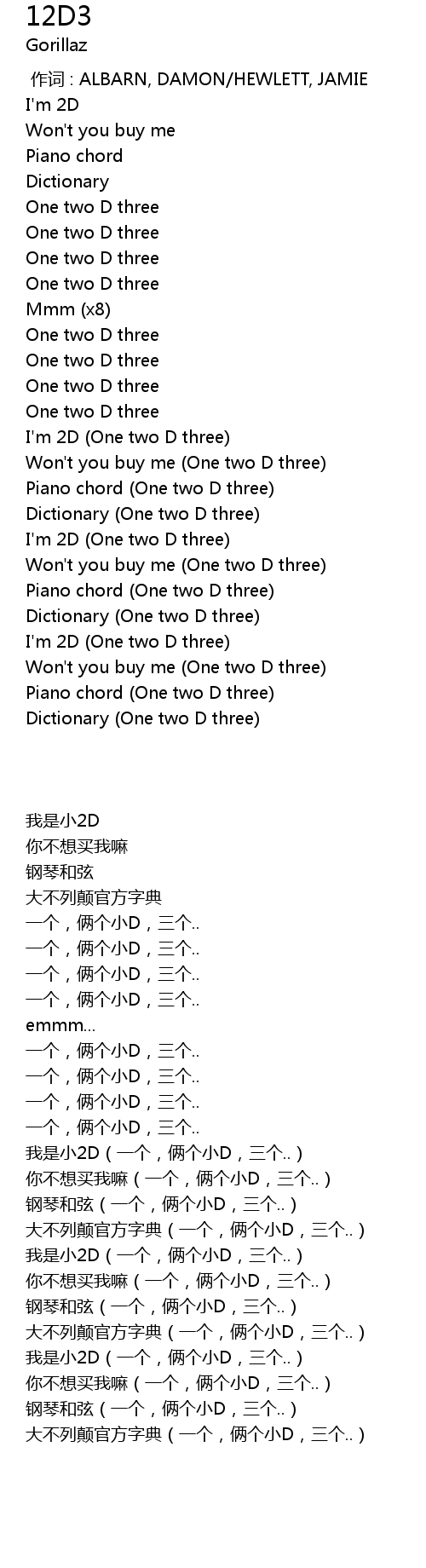 | [00:00.00] | 作词 : ALBARN, DAMON/HEWLETT, JAMIE |