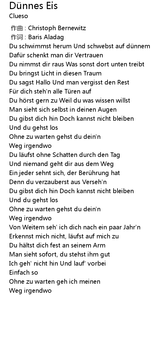 [00:38.54] Du schwimmst herum Und schwebst auf dünnem Eis