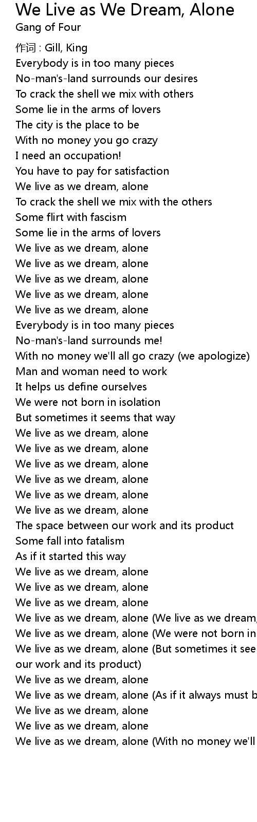 | We live as we dream, alone With no money we' ll all go crazy |