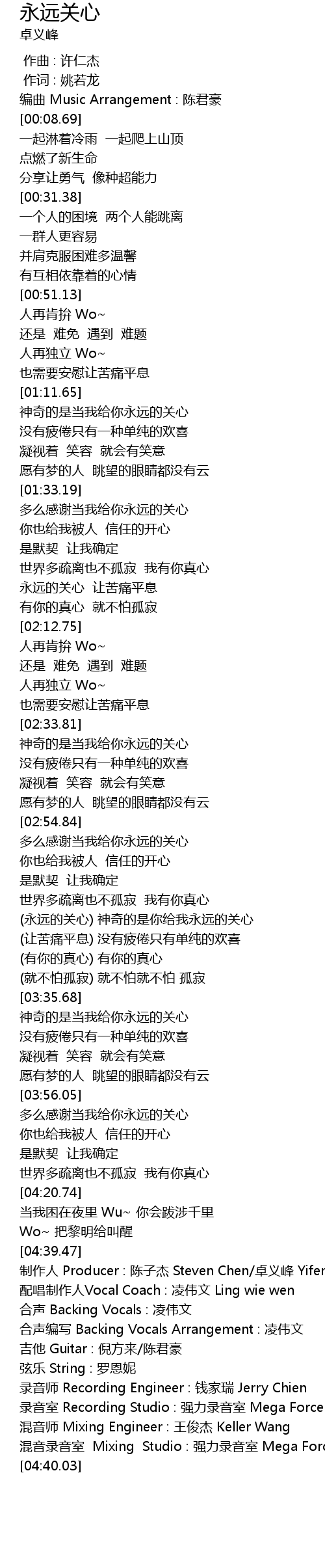 | [03:16.02] | yǒng yuǎn de guān xīn shén qí de shì nǐ gěi wǒ yǒng yuǎn de guān xīn |