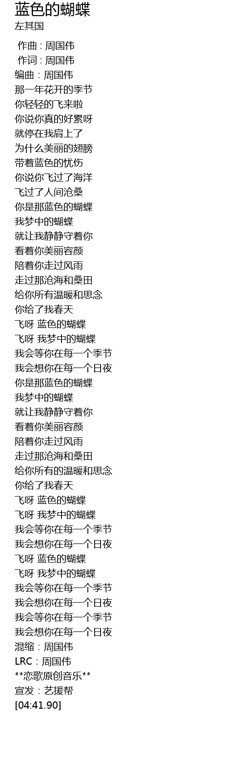 | [01:41.16] | 飞呀 蓝色的蝴蝶 |