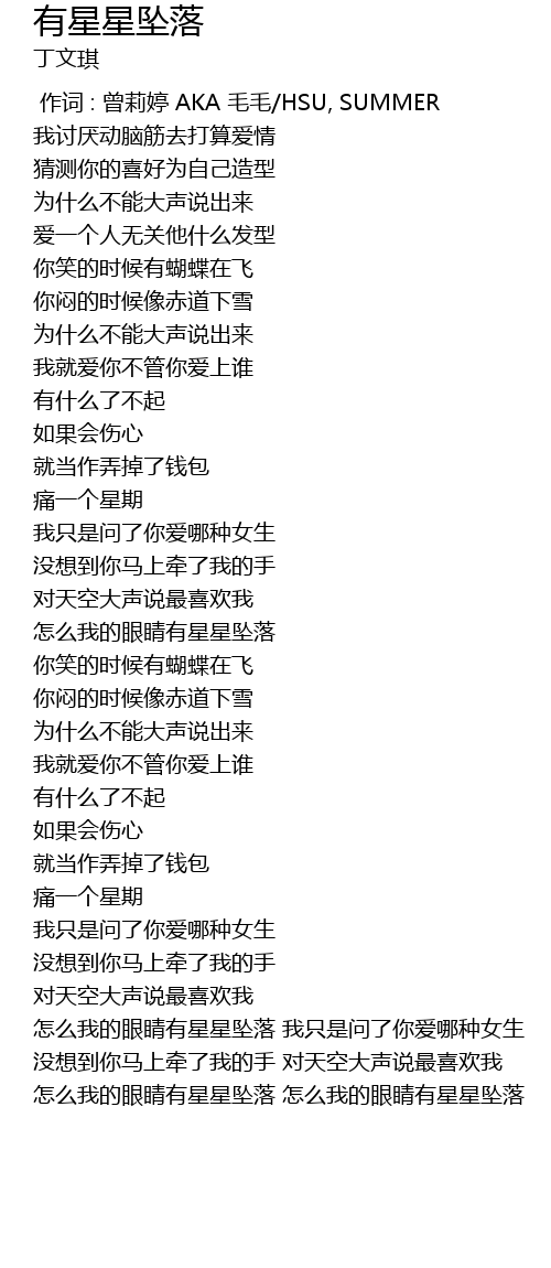 | [02:39.55] | 怎么我的眼睛有星星坠落 我只是问了你爱哪种女生 没想到你马上牵了我的手 对天空大声说最喜欢我 怎么我的眼睛有星星坠落 怎么我的眼睛有星星坠落 |