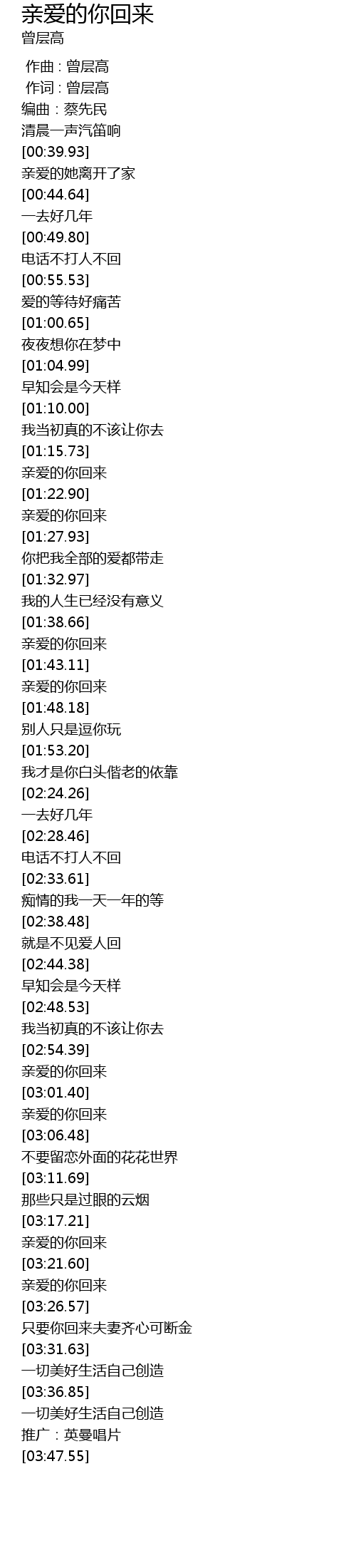 | [01:38.92] | qīn ài de nǐ huí lái |