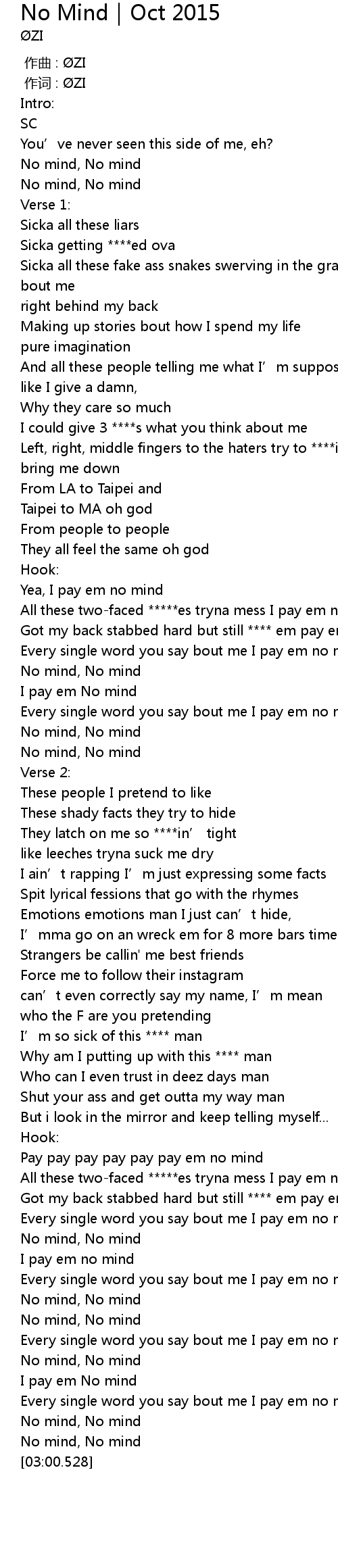 | [00:55.783] | All these two-faced *****es tryna mess I pay em no mind |