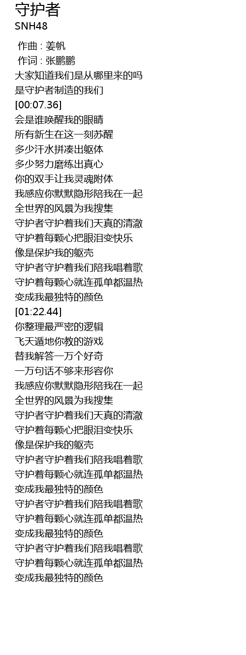 | [02:22.39] | 守护者守护着我们陪我唱着歌 |