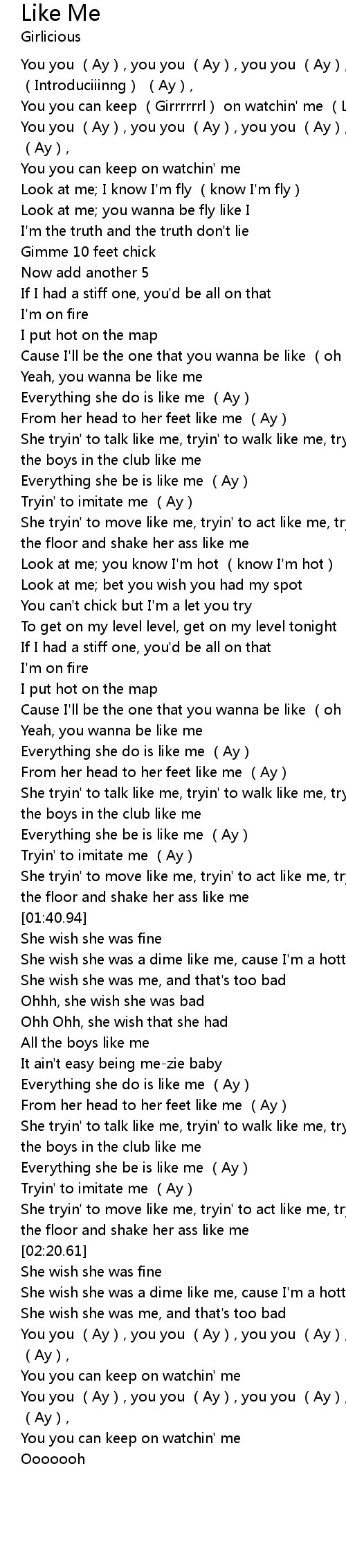 | [00:45.11] | She tryin' to talk like me, tryin' to walk like me, tryin' to get all the boys in the club like me |