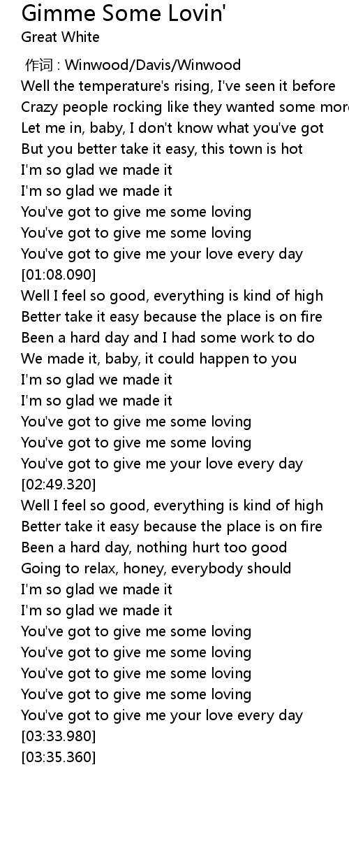| [03:18.750] | You' ve got to give me some loving |