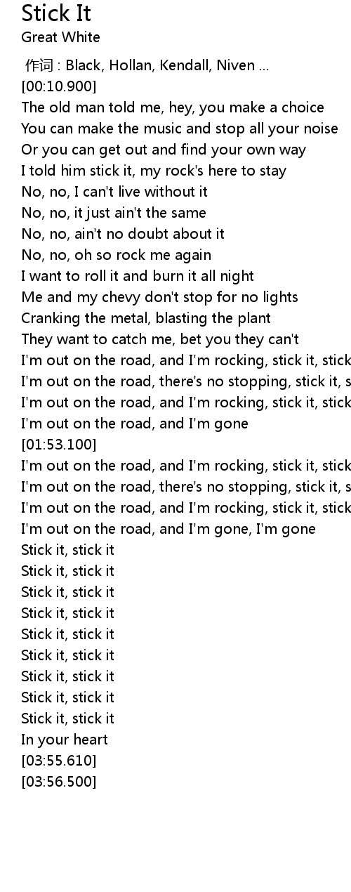 | [01:31.410] | I' m out on the road, there' s no stopping, stick it, stick it |