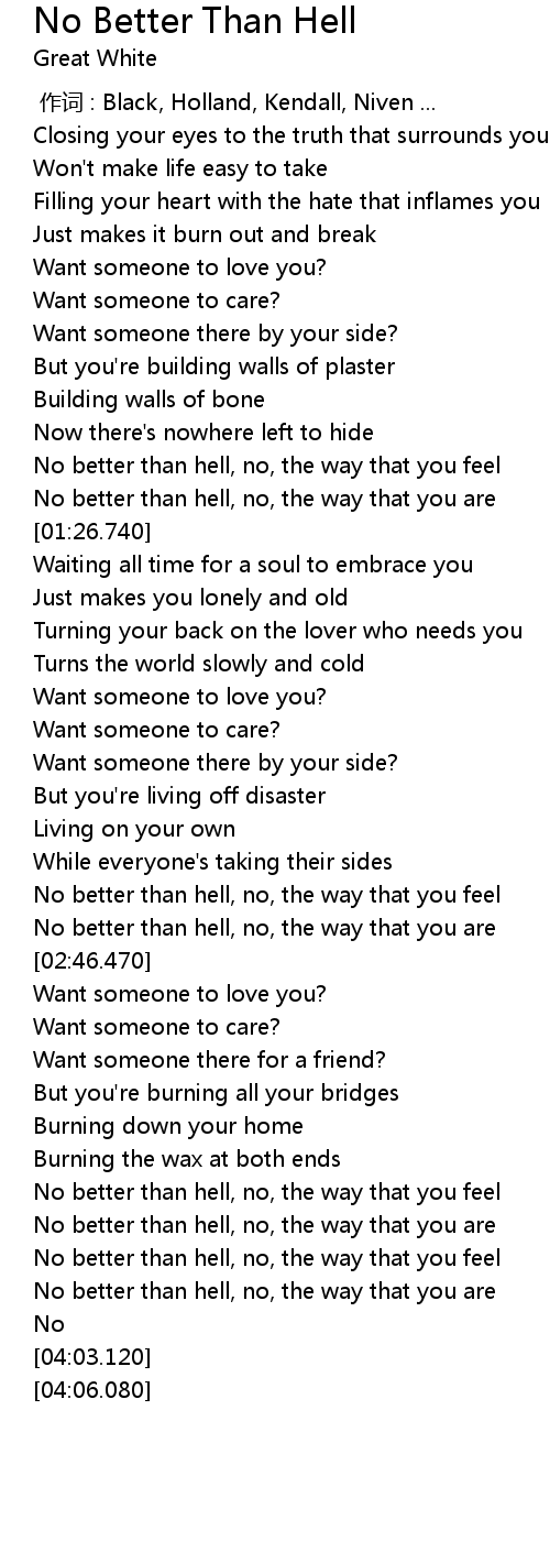 | [03:23.800] | No better than hell, no, the way that you feel |
