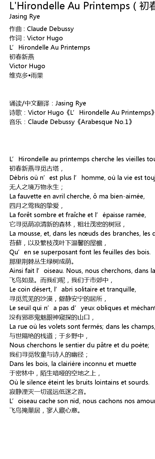 | 诗歌:Victor Hugo《L’Hirondelle Au Printemps》 | |