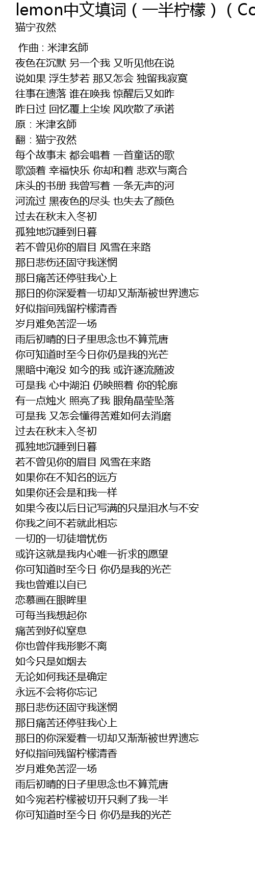 | Song | lemon中文填词(一半柠檬)(Cover:米津玄師) |