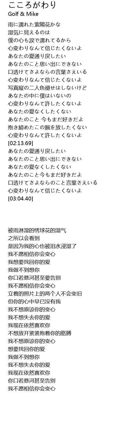 | [02:55.53] | 心変わりなんて信じたくないよ |