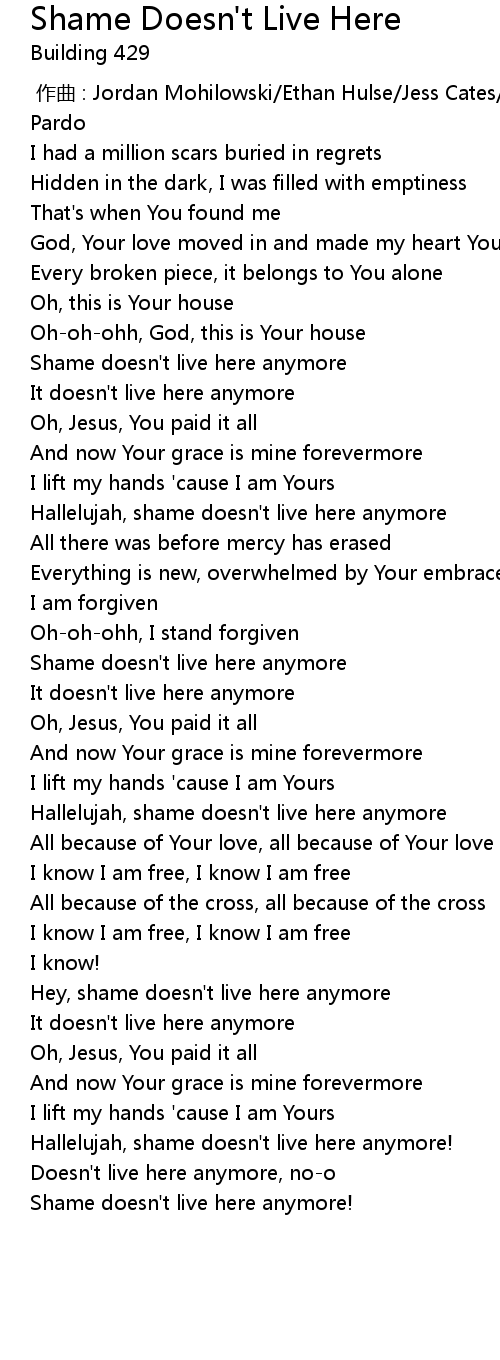 | [02:18.87] | Hallelujah, shame doesn't live here anymore |