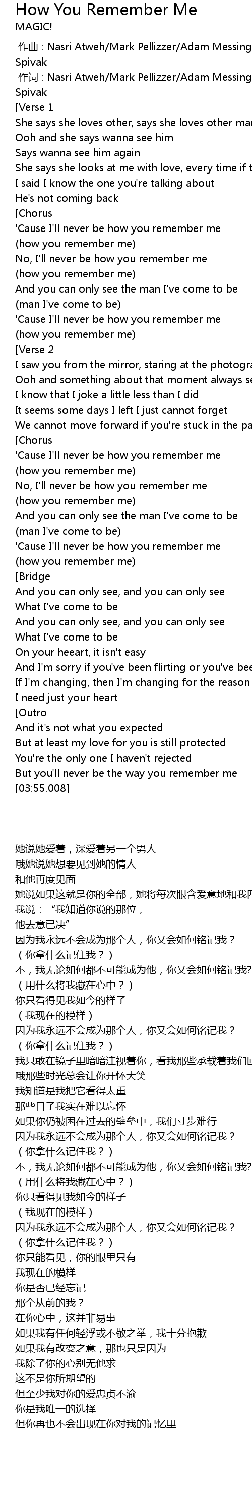 | [00:53.643] | ' Cause I' ll never be how you remember me |