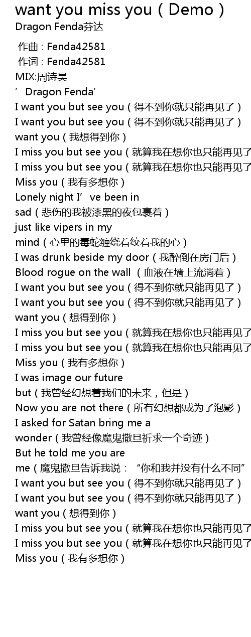 | [01:06.952] | I want you but see you de bu dao ni jiu zhi neng zai jian le |